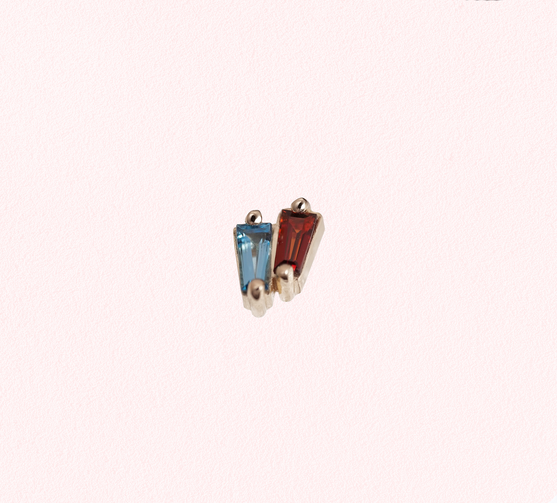 Darby is a showstopper that brings some serious sparkle to the table. This stunner features a step-cut tapered double baguette of mozambique garnet and London blue topaz, cradled in warm 14k yellow gold. The geometric precision of the step cut catches light beautifully, while the deep crimson tones of the garnet add drama and sophistication. A gem that's equal parts elegant and fun.